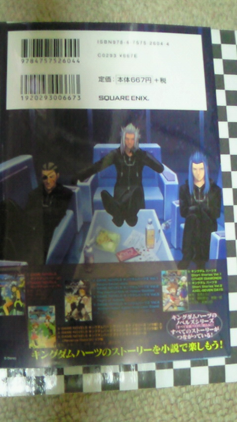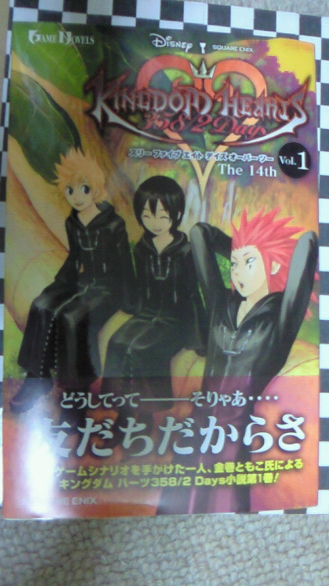 今日は2回目の更新です^^ 10月1日にしっかりと送って、送信完了になってたのに、 更新されていなかった謎は、未だに不思議です^^; キングダムハーツ358/2Daysの小説を、この前本屋で買いましたw 自分は基本、小説にはカバーをかけてもらうのですが、 「カバーをかけますか?」 と聞かれたので“はい、お願いします”と答えたのに、カバーをかけてもらえませんでした;; しかも、本を袋に入れる時が雑で、 一緒に買ったゲーム雑誌が少しボロボロになりそうでハラハラしました(汗) あの時の店員さんは新人さんだったんでしょうか; 本の扱い方には気を付けて欲しいです;; ちなみに小説の表紙は、ロクサスとアクセルとシオンの3人組で、 後ろを見たら、ゼムナスとシグバールとサイクスがいましたw