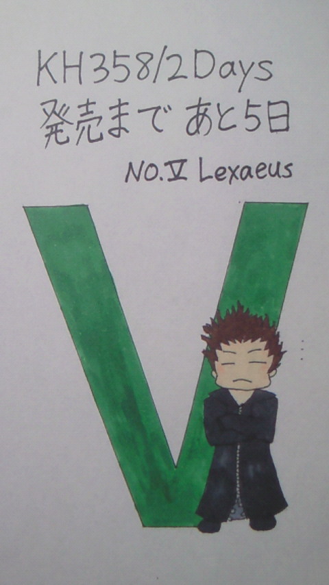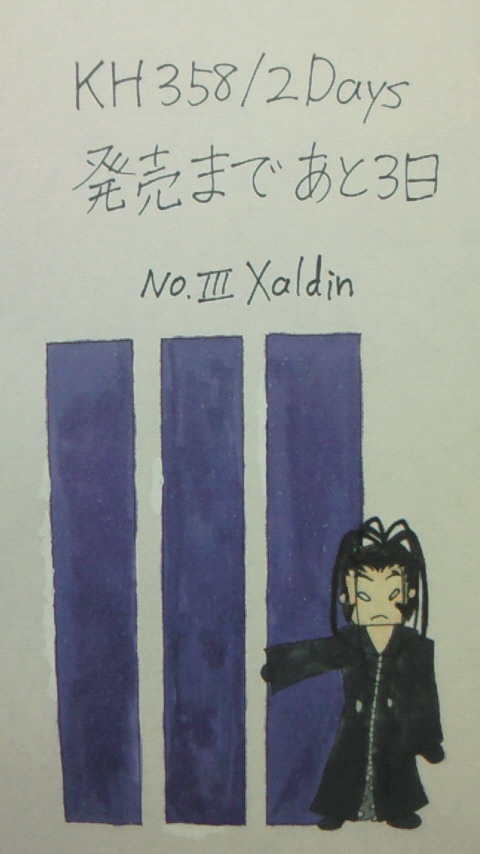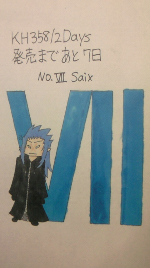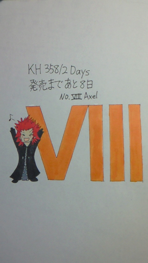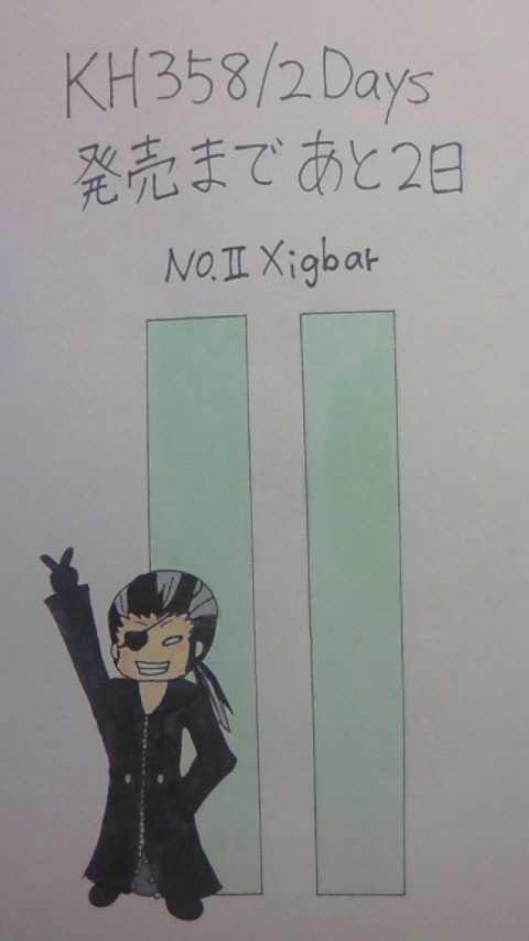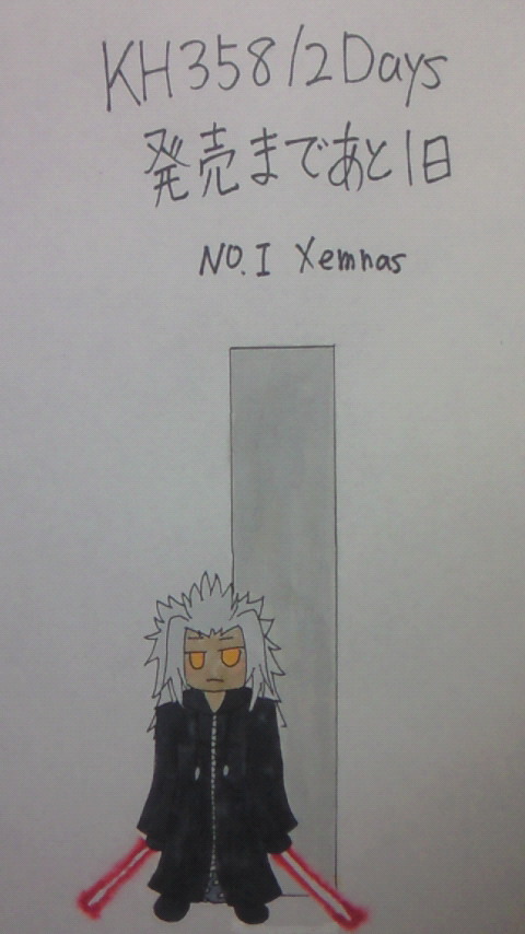 KH358/2Daysの発売まであと1日です! ついにこの時が来ました!! 今日はナンバーⅠのゼムナスですw 正直一番苦労したのは、武器のエアリアルブレードです^^; 最初は赤い棒を描くだけでいいと思ってましたが、 資料を見たら、白くて周りが赤色だったので苦労しました; 発売があと1日となると実感が中々湧きません; でも、明日やっと待ち望んでいた日が来ると思うと、明日が楽しみで仕方がありません^^ いつもは土曜日にする課題や学校の準備は今日で終わらせておきましたw これで明日はKH三昧です^^ 学校では“いよいよ明日”と思うたびに、昨日同様ニヤけてましたw テンションも、いつもより高かったと思いますww とにかく明日、5月30日という日が楽しみです^^ PR KH358/2Daysの発売まで、あと2日です! 今日はナンバーⅡのシグバールですw 構図が思いつかなかなく、何も持たないで直立不動は合わないと思ったので、 指で2を表したんですけど、描いてから“やっぱりやめた方が…”と思ってしまいました^^; (でも、武器が描けないんです;;) それと、KH358/2Daysの公式サイトで、 「キャラクター」でサイクスが追加、 「システム」で情報第8弾が追加、 「ムービー」で店頭用PVとCM2本(期間限定)が追加されました! http://www.square-enix.co.jp/kingdom/days/発売があと2日となると、学校でもニヤけてきます← 明日は帰ったら土日分の課題をすべてして、土日はKH三昧にしようと思いますw 昨日、ピアノ・コレクションズKHのCDを買ったので、 そのCDを聴きながら、いらない紙切れにイラストを描いてましたw そのイラストがコレです↓ いらない紙に描いたので、鉛筆だけでペン入れとかしていないので見にくいです^^; この絵を描きながら「Roxas」とか「The Other Promise」などを聴いてましたw いらない紙に描いたものに限って、気に入ったものが描けてしまうんです^^; ピアノ・コレクションズKHが届きましたーw
