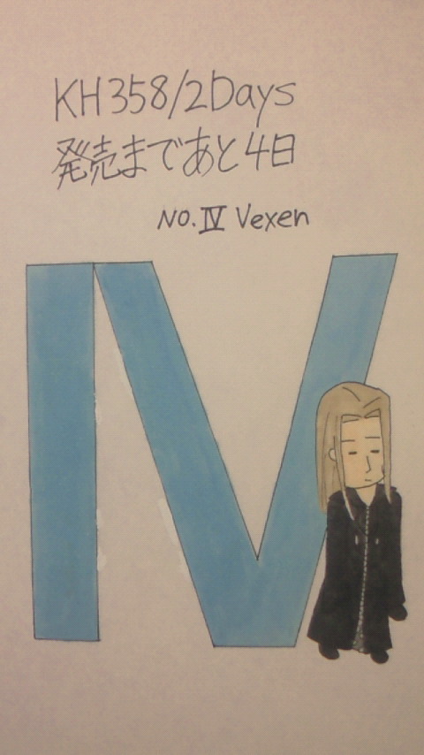 ちなみに裏面はコレですw↓ 夕焼けです^^ ファミ通.comにも、CDの情報がありますw 『キングダム ハーツ』シリーズ初のピアノアレンジCDが発売 ファミ通.comKH358/2Daysの発売まであと4日です! 今日はナンバーⅣのヴィクセンですw 何故か彼を描いてるときが楽しかったです^^; (多分、髪型が一番シンプルだからかと思います♪) この軟禁生活も、明日になったら解除です。 連絡網が回ってきたんですが、明日から学校へ登校しないといけないみたいです^^; 課題のない軟禁だったらもう2,3日あってもよかったんですが← 昨日友達から、「学校って明日(つまり今日のことです)からやんな?」 ってメールが来たときは驚きましたが; (ちゃんと連絡網で登校日を知らせてくれると教えておきました^^) そういえば、「ダレン・シャン」の漫画の最終巻を読んで、号泣しました;; 自分は小説を読もうと思ったら、リアルなクモが少し載ってると聞いたので、小説は読めません(クモ嫌いなもので^^;) 漫画に描かれていたクモはギリギリセーフだったので読んでいたのですが、 最終巻はまさかの号泣をしてしまいました;; デフォルメのⅩⅢ機関をずっと描いていると、たまにデフォルメじゃないのが描きたくなってきます^^;