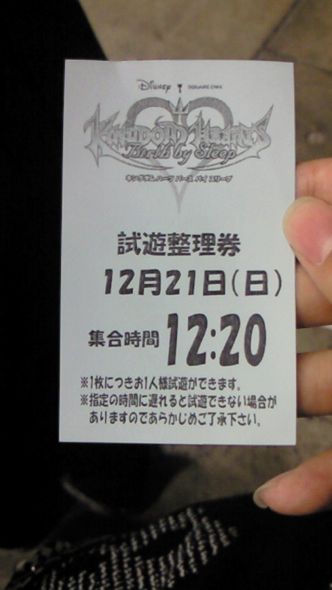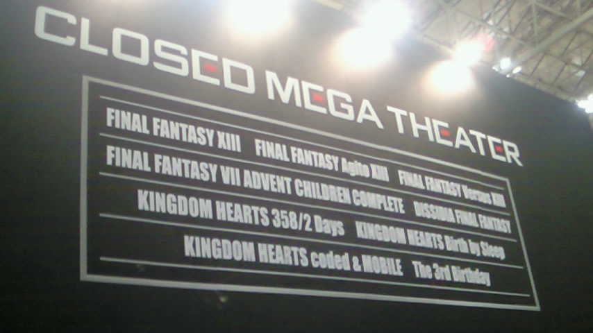 待ち時間はすばせかをプレイしてましたw 【クローズド・メガシアター】 (※注意 朝の初回を観たので、100%覚えているわけではないので、断片的に思い出せるところしか書けません;;そこらへんはご了承下さい) 毎回恒例のクローズド・メガシアターの案内。今回はKHシリーズのリク役でお馴染みの宮野真守さんでしたw(前は入野さんや櫻井さんでした) 始まる前まで、drammmaticaの「The 13th Anthology」が流れ、カウントダウンの時間までありました。 一応流れた順番に紹介します(順番すらあやふやですが^^;) まずは、DFFのCM2種類が流れました。 『KHモバイル』 ・新しいミニゲームや建物が建てられるらしいですw 『KHcd』 ・今回はTGS2008と同じトレーラーでした。 『KHBbs』 ・今回はTGS2008と同じトレーラーでした。 『KH358/2Days』 ・BGMは「Passion ~after the battle~」 ・デスティニーアイランドの浜辺でロクサスがサラサ貝を拾い、「シオン…」と呟きながら、サラサ貝を見つめる ・公式サイトのトレーラーでお馴染み、ビーストキャッスルでリクと(フードを被った)シオンの戦いキーブレードでリクを攻撃しようとするが、リクはかわして、シオンを攻撃。 ・デスティニーアイランドでリクとシオン シオン「友達を奪ってるあたしが憎い?」と悪者顔(?)を作りリクに言う リク「そうじゃない ただ 悲しいな」 シオンはハッと悲しい顔をして「ごめんなさい でも 今は消えるわけにはいかないの」と言う ・デスティニーアイランド(?)でゼクシオンがロクサスに何かを見せ、ロクサスが動揺する(自分がソラのノーバディだと分かった?)、そしてリク(KHⅠver.)がロクサスの背後から登場する。 ・トワイライトタウンでロクサスは、探してたシオンと出会い、逃げようとするシオンにロクサスはシオンの手を掴むが、シオンが振り払い、ロクサスにキーブレードを向ける。そしたらアクセルのチャクラムがシオンを襲い、シオンはキーブレードで防ぐ。そのまま、シオンとアクセルは戦うことになり、ロクサスは「やめろ!」と2人に言う。 ・トワイライトタウンの時計台でロクサスとアクセルがいて、ロクサスは「遅いな」とシオンを待つ。アクセルは寝そべって、何か思い悩んだような表情を浮かべる。 ・幽霊屋敷の前でシオンとアクセルが対峙 シオンは“ただ あたしは帰るところに帰るだけ”とアクセルに言う。 ・ロクサスとシオンは忘却の城に行った事がある。 ・トワイライトタウンの時計台でロクサスと(フードを被ったシオン) シオンは忘れちゃいましたが、何かを言い、フードを取る。ロクサスがシオンを見て驚く。 ・2月発売予定から春の予定になりました。 『The 3rd Birthday』 ・今回はTGS2008と同じ内容でした。 そして、この前の「ゲームセンターCX」『自分トコの地域では映りませんでした;;」のDFFトレーラーが流れました。 『FFⅦACC』 ・ツォンとイリーナがカダージュ、ロッズ、ヤズーに襲われたシーンも収録。 ・カダージュの服が再生されてました。 ・デンゼルの出番も多く、声も流れました。声変わり前の声でしたが、事前に池田恭祐さんの声をとっていかのか、それか違う人がしているのかは分かりません^^; ・ヘリコプターからレノとルードがロッズ、ヤズーに攻撃して、活躍してました。 『FFアギトⅩⅢ』 ・今回はTGS2008と同じ内容でした 『FFⅩⅢ』 ・今回はライトニング、スノウ、ヴァニラ、そして新しく登場のキャラクターにも声がありました。 ・男2人と女1人の新キャラクター登場(一人の男の子は「~ッス」という口癖 確か名前が“サッズ”“レブロ(リプロだったかも)”“ガトー”でした。(バトル画面から見たので、誰がどの名前かは分かりません) ・スノウが自分の使っている銃を“誰か使うか?”と捕らわれてた人たちに言うと、ローブを纏った女の子(ヴァニラ)が両手いっぱいに広げて、スノウから銃を渡してもらう。 ・セラについての会話 スノウ“セラを守る”ライトニング“守れなかったじゃないか”という話になり、ライトニングはスノウに拳でパンチ×2 ・ライトニングはやっぱりクールビューティーな声で、スノウはカッコいい声、今回初公開のヴァニラの声は可愛い声でした。 『FFヴェルサスⅩⅢ』 ・ノクトとステラは一度死に掛けたことがある。ノクトは死に掛けた時のことを「あれはやばかった」と言う。 ・死に掛けたら、特別な力が手に入る言い伝えがあり、テネブラエでも、2人がいる国もそんな言い伝えがあるらしい ・“ノクティス様”と言うステラに「ノクトでいいよ」と言うが、それを行った後も“ノクティス様”と言うので、ノクティスが「ノクト」というが、ステラは「次会った時にはそう呼びます」と返す。 【ゲーム体験】 『KH358/2Days』 今回はTGS2008と同じ体験版でした。 最初はシグバールのハロウィンタウンを選びました。 アイスキューブがシグバールを攻撃して、シグバールの足が氷漬けになってました。 今回は整理券なしだったので、並んでさえいれば、体験する事ができましたw 