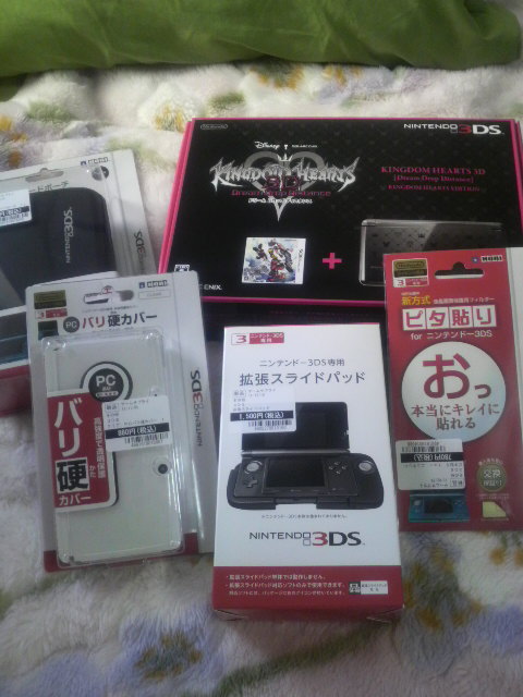 ・『キングダムハーツ3D[ドリームドロップディスタンス]』同梱版 ・液晶シート ・プロテクトカバー ・拡張スライドパッド ・ハードポーチ 実を言うと、同梱版は、誰もが知る通り入手困難で、自分も予約出来ない状況でした。 最初はe-STOREで購入したかったのですが、予約出来ず… 近くのゲームショップに行っても予約を受け付けられない状態… なので、最終手段を使う前に、 弟(長男)に時間があれば、ゲームショップに在庫があるか聞いてほしいと頼みました。 彼はクールで話しかけづらく、近寄りがたいので、最初は頼むか悩みましたが、 頼りになるのが弟(長男)だけで、親や弟(二男)には頼めなかったのと、 同梱版を手に入れたい!っという気持ちで、勇気を出して弟(長男)に頼んだんです^^; 頼んでから直ぐ、色んな場所に問い合わせてくれたみたいで、 色んなゲームショップを問い合わせても、無いと言われたんですが、 何軒目かの最後の1つだけ在庫があったので、予約してくれました! 本当に感謝してます^^ 購入する為に、実家に帰り、購入後は直ぐに関東に戻りました← 自分の他に弟(二男)もソフトだけを購入しました^^ (因みに、『キングダムハーツ バースバイスリープ』の時は 3人兄弟全員が購入したんです) 購入した時に、クリアファイルも貰いました! 本日、3月29日木曜日、いよいよ…
